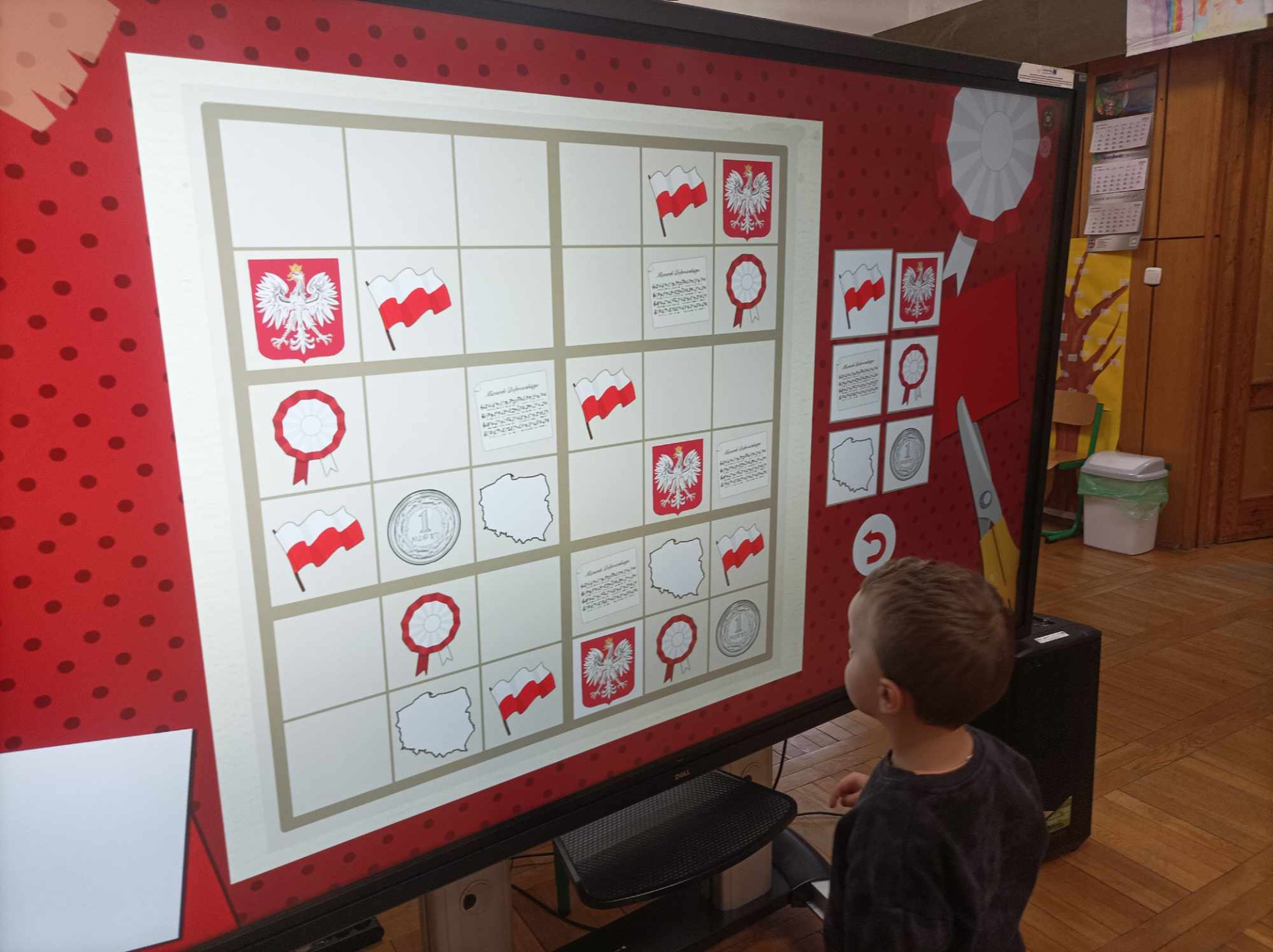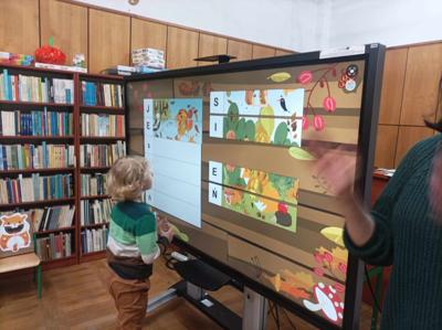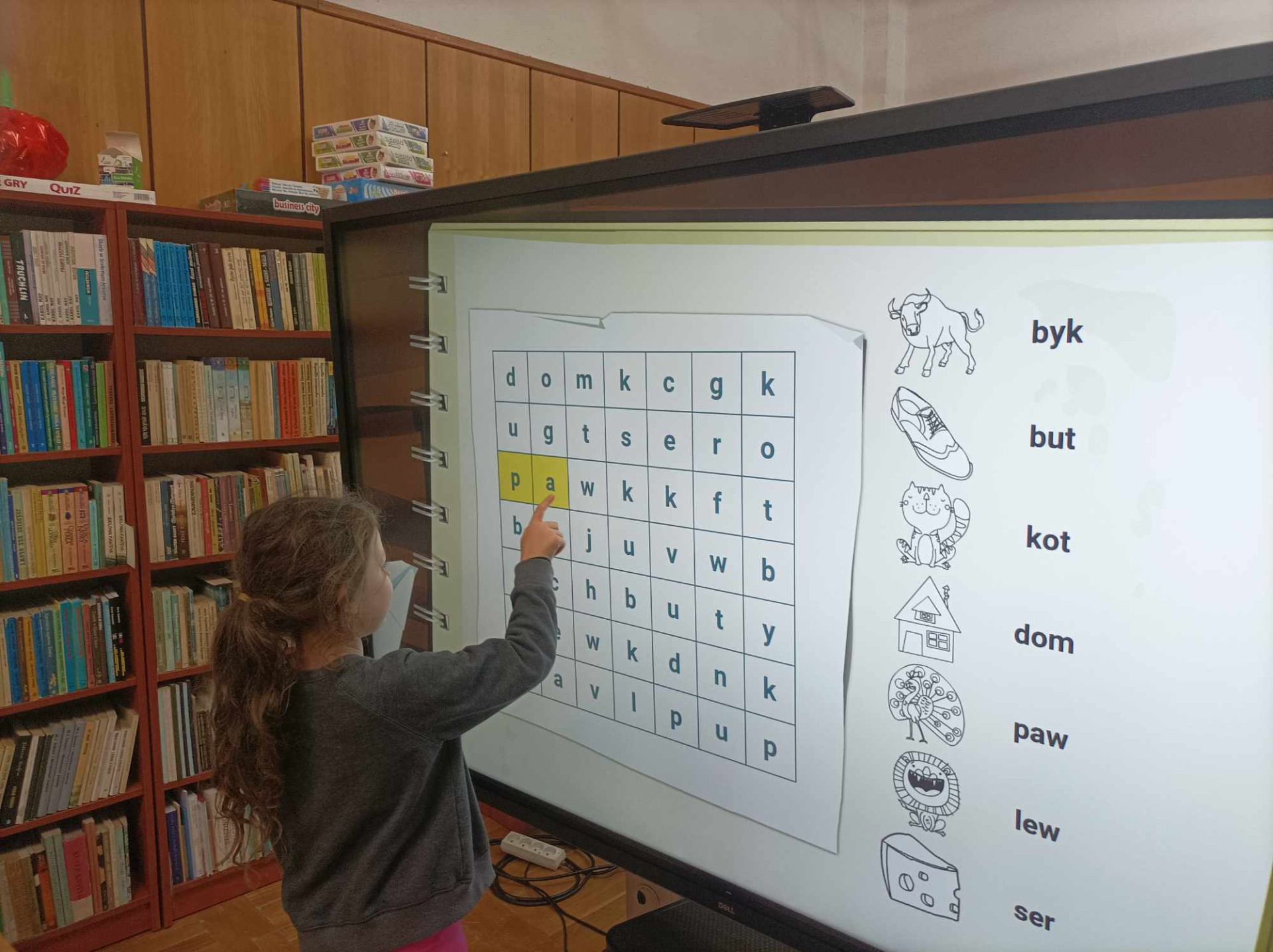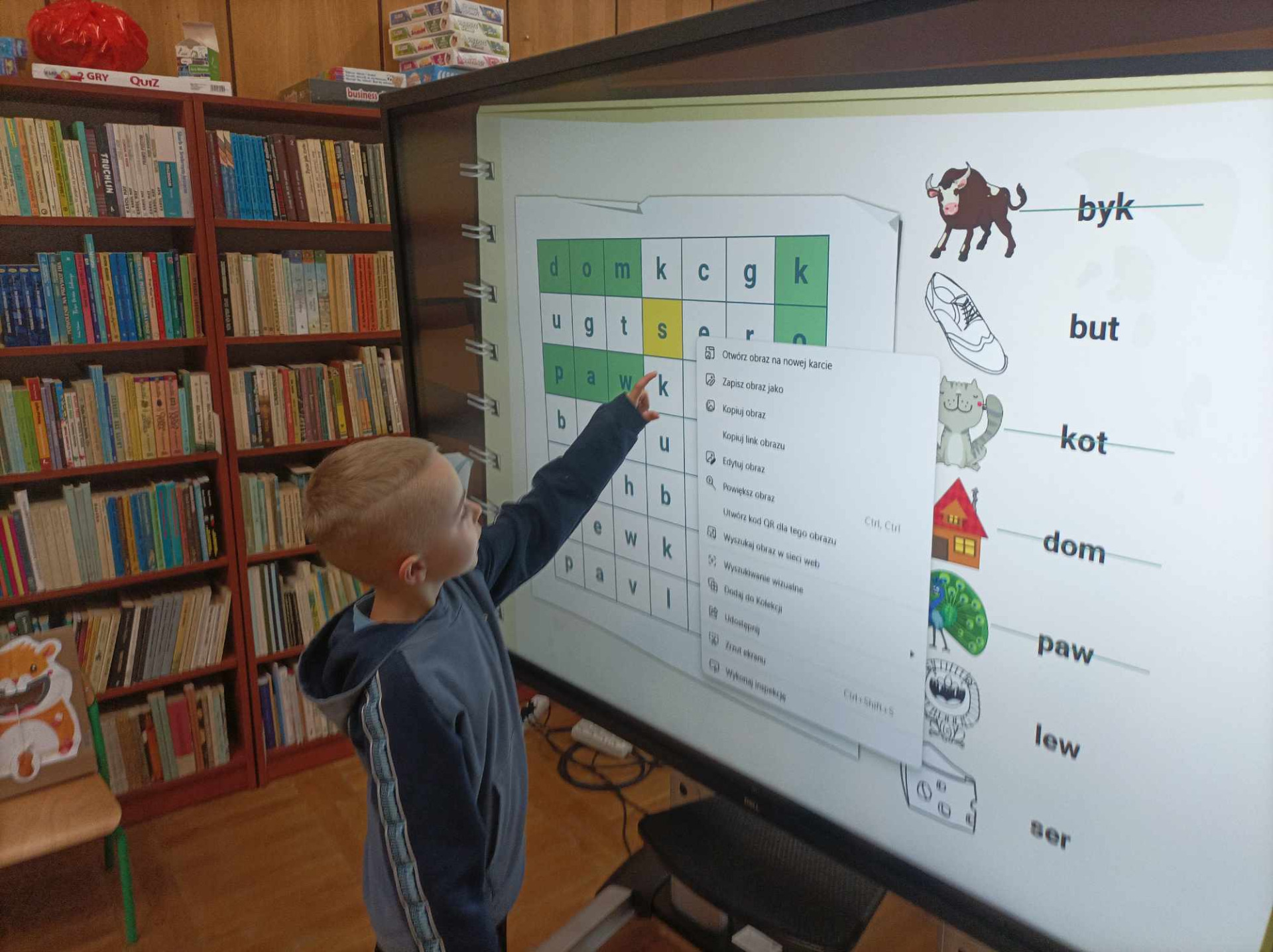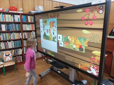 Następnie na przedszkolaków czekały interaktywne zadania z wykorzystaniem tablicy multimedialnej. Dzieci układały puzzle, grały w sudoku oraz wyszukiwały ukryte słowa, co było świetną okazją do nauki przez zabawę. Kolejną atrakcją było oglądanie bajki o Kaczorze Donaldzie, która przyciągnęła uwagę młodych widzów.
