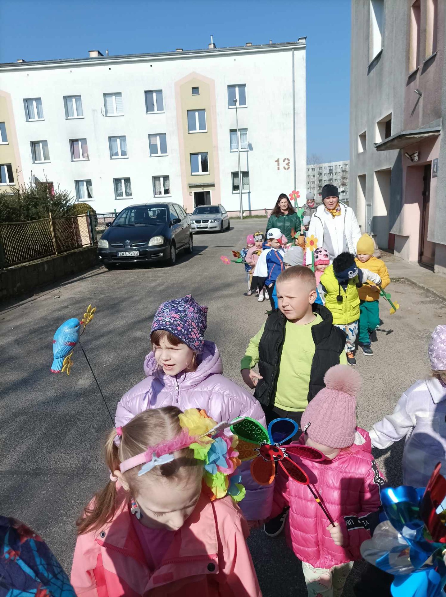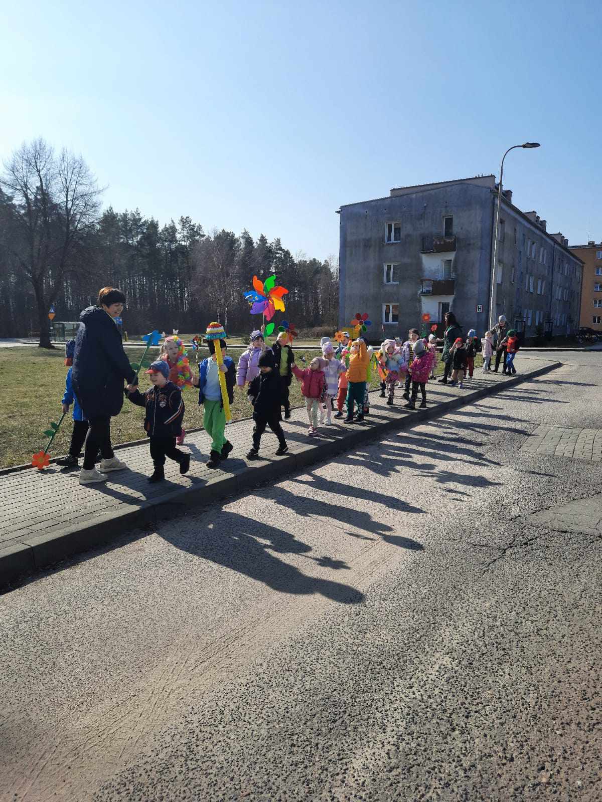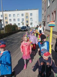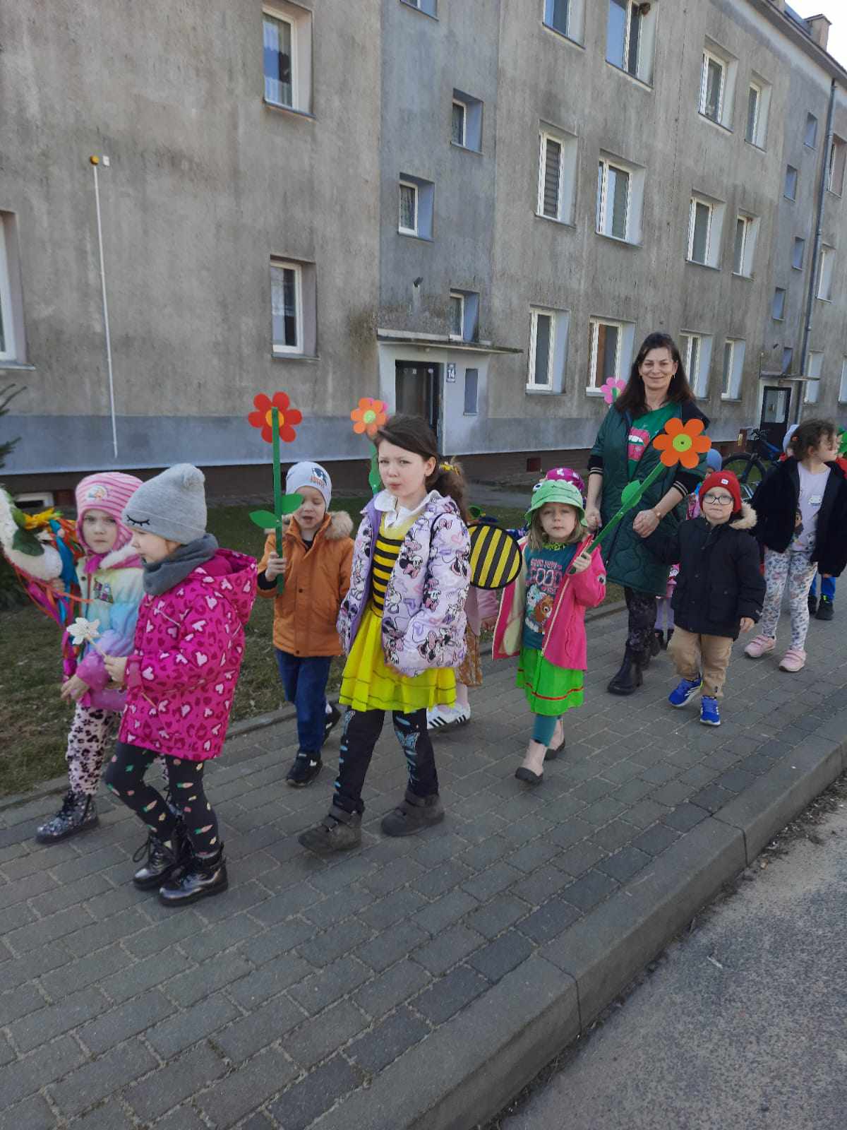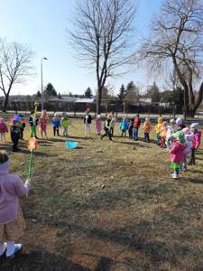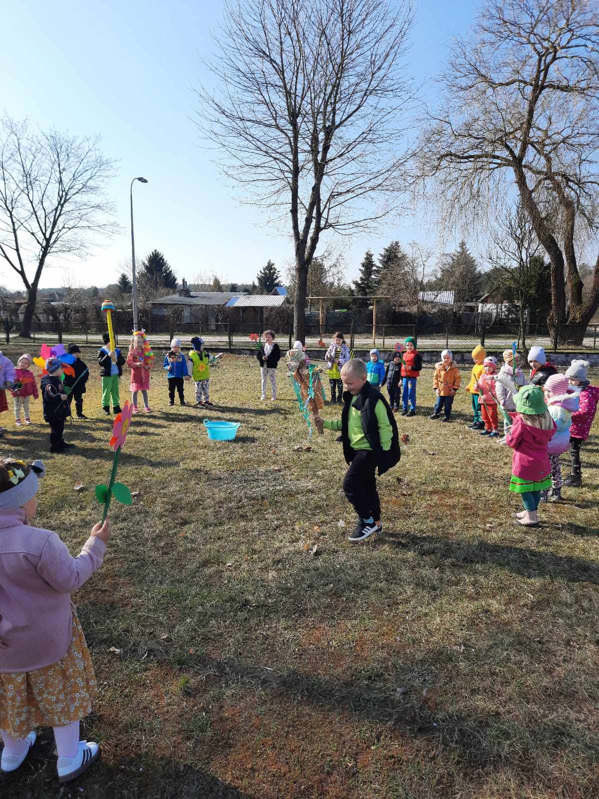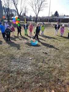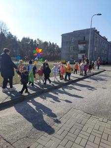 Kolejnym punktem programu było uroczyste pożegnanie zimy. Na placu przedszkolnym, przy dźwiękach piosenki "Marzanna", dzieci symbolicznie utopiły kukłę, żegnając w ten sposób mroźne dni. Następnie cała grupa wybrała się na wiosenny spacer ulicami osiedla, niosąc kolorowe kwiaty i wiatraczki. Barwny pochód wzbudzał duże zainteresowanie i radość wśród mijanych przechodniów.