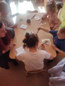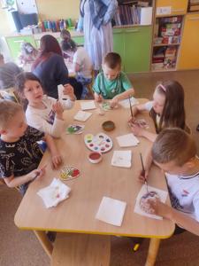 Dzieci rozwiązywały wielkanocne zagadki, układały puzzle, wybierały obrazki związane z Wielkanocą, poznawały różnice między pisanką a kraszanką i kompletowały zawartość świątecznego koszyczka. Na zakończenie wykonały pracę plastyczną – malowały farbami drewniane sylwety pisanek, wykazując się kreatywnością i precyzją.