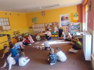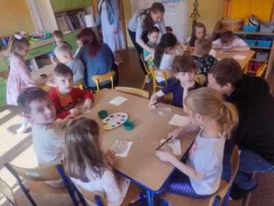 Dnia 15 kwietnia 2025 roku w grupie "Motylków" odbyły się zajęcia otwarte dla rodziców pt. "W Wielkanocnej Krainie", których celem było zapoznanie dzieci z wielkanocnymi tradycjami. Przedszkolaki przeliczały elementy w zakresie 10, porządkowały je według liczby, klasyfikowały, utrwalały cyfry i litery, odczytywały proste wyrazy.