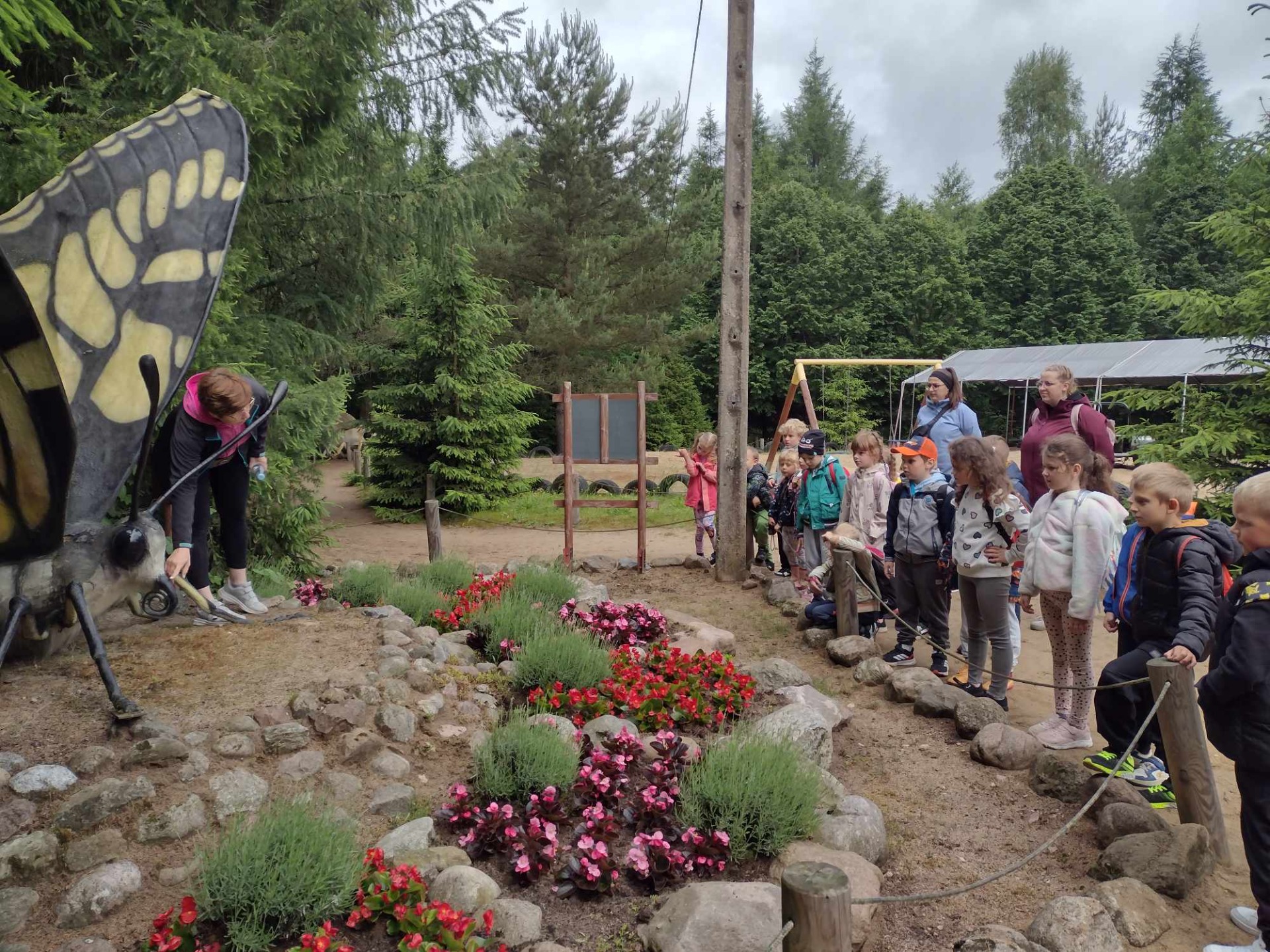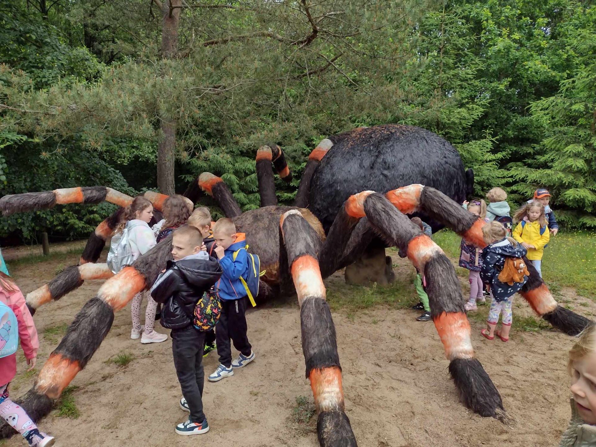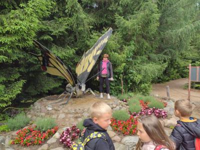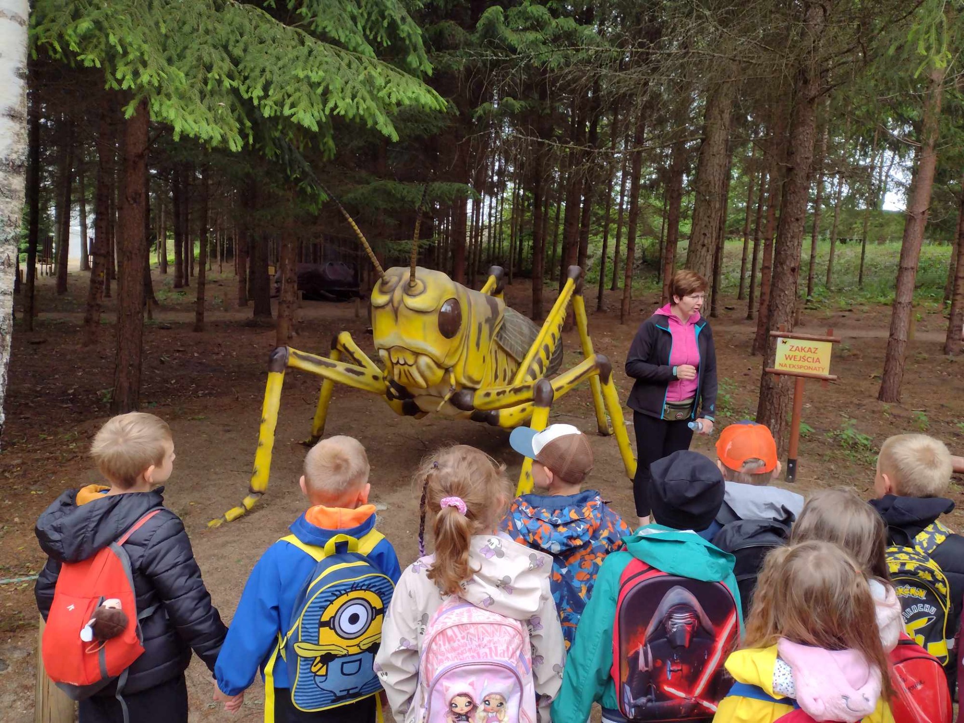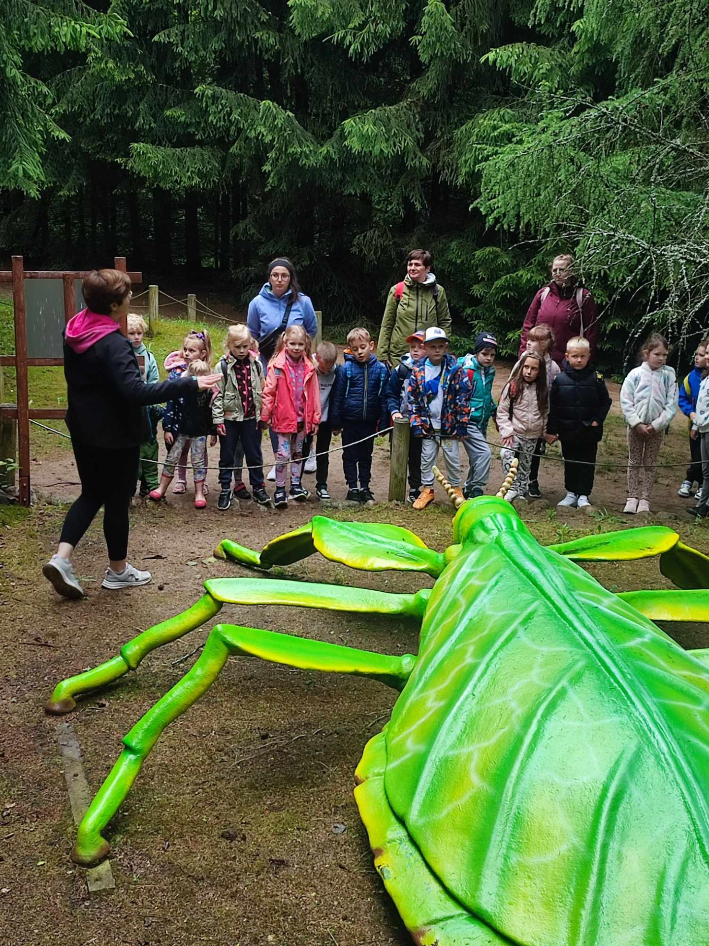 Po dotarciu na miejsce rozpoczęliśmy spacer ścieżką dydaktyczną, podczas którego dzieci mogły podziwiać ogromne modele owadów. Przewodniczka opowiadała wiele interesujących ciekawostek przyrodniczych na temat każdego z nich, co wzbudziło duże zainteresowanie i zachęcało dzieci do zadawania pytań.