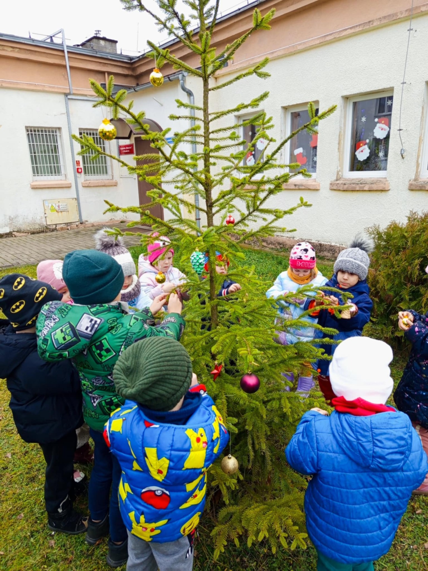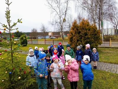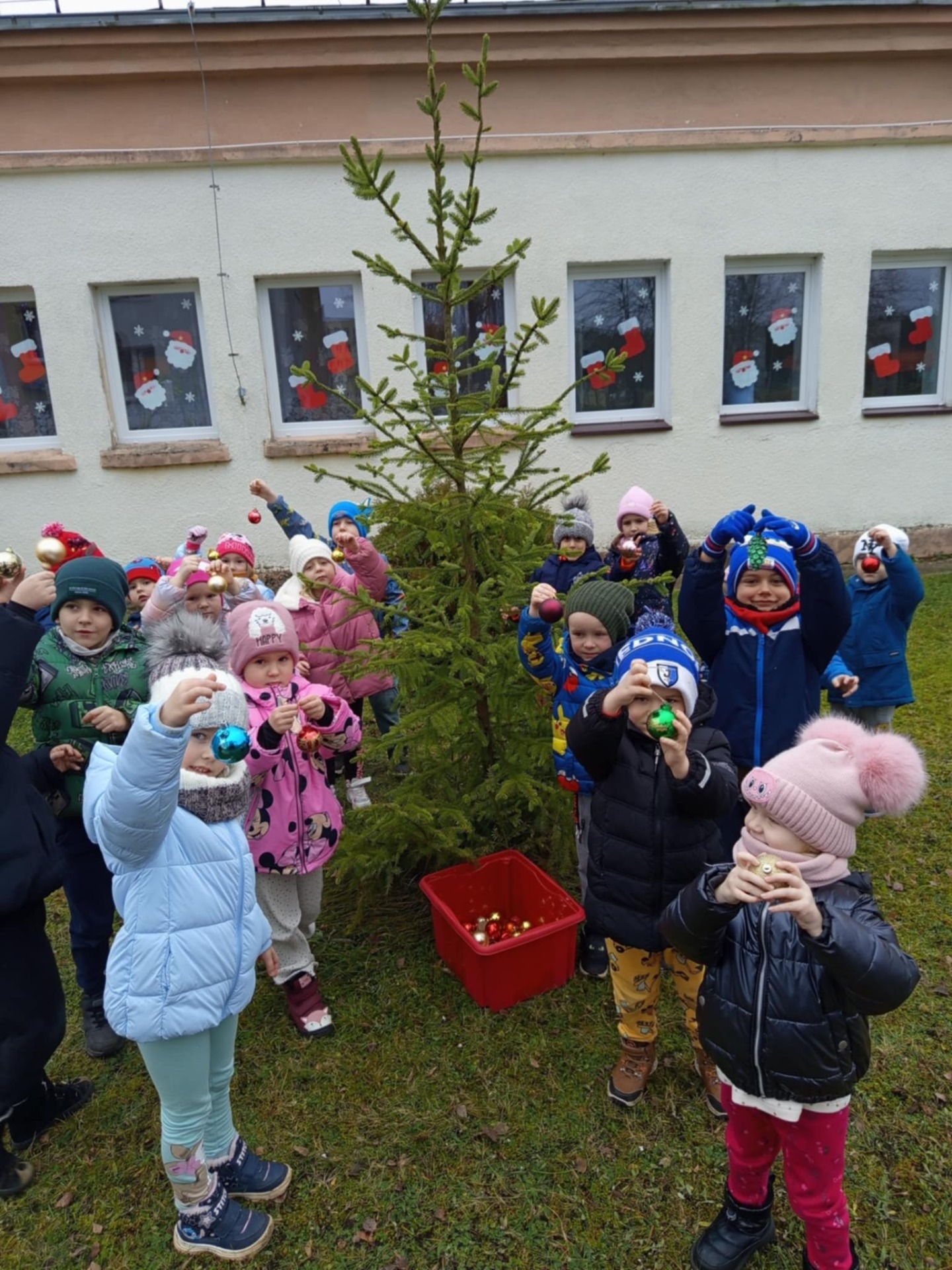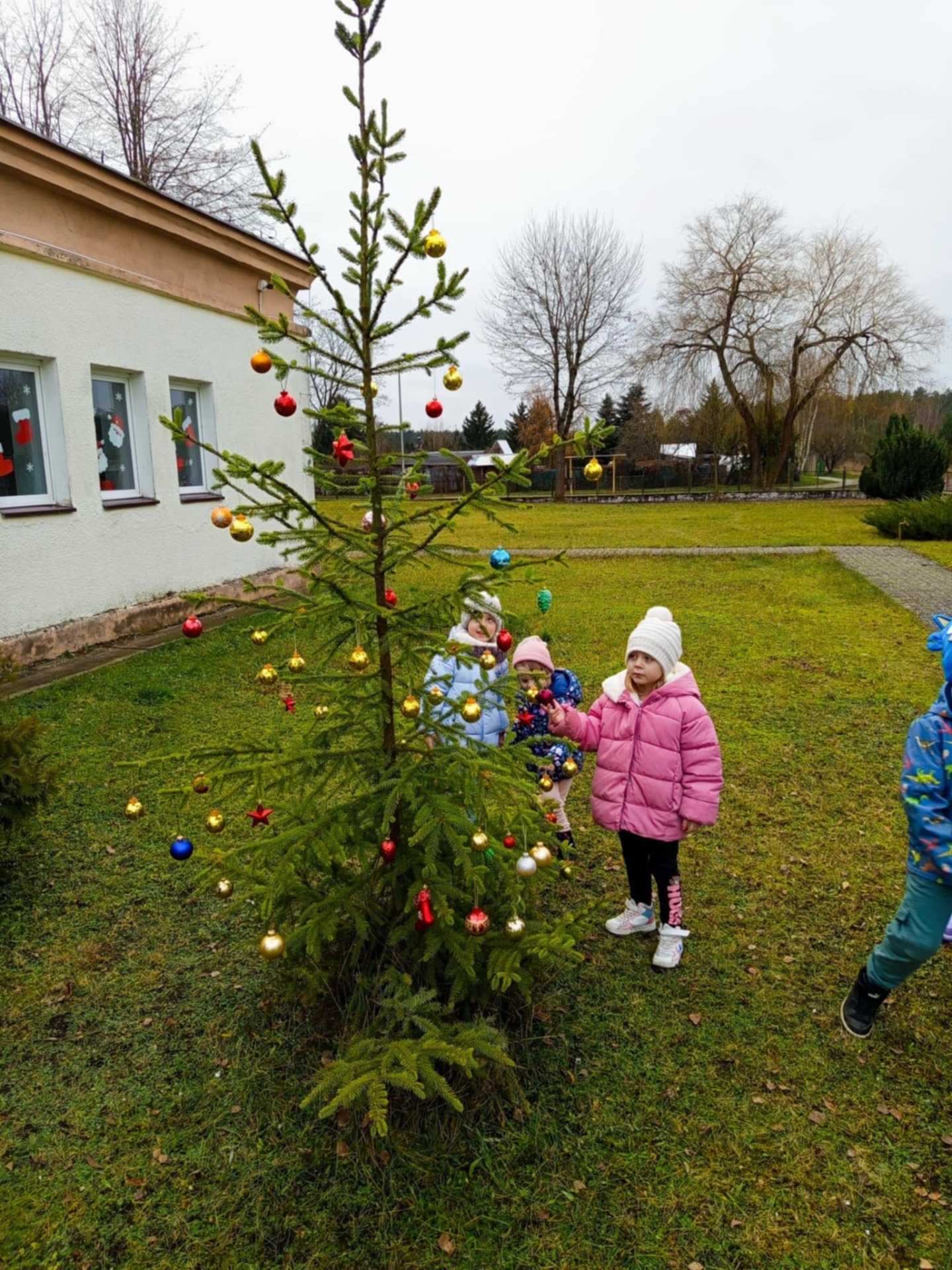 12 grudnia dzieci przystroiły choinkę, która została posadzona rok temu przed przedszkolem. W jej ubieraniu uczestniczyły „Biedronki” oraz „Motylki”. Podczas strojenia drzewka na twarzach najmłodszych widniały uśmiechy, dzieciom bardzo spodobało się dekorowanie drzewka. Teraz tylko pozostało nam czekać na śnieg...