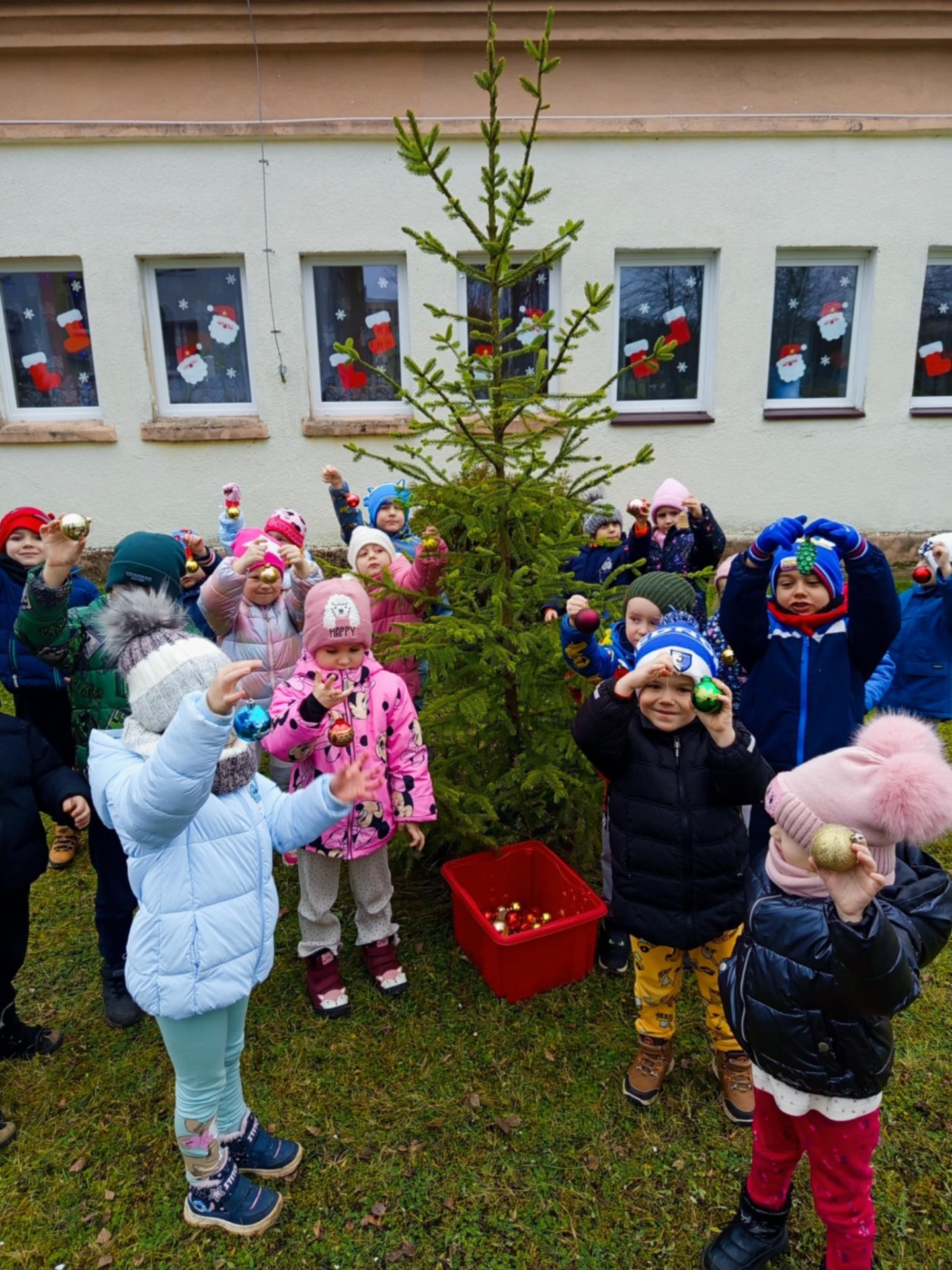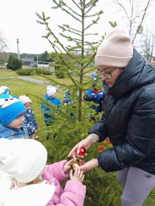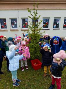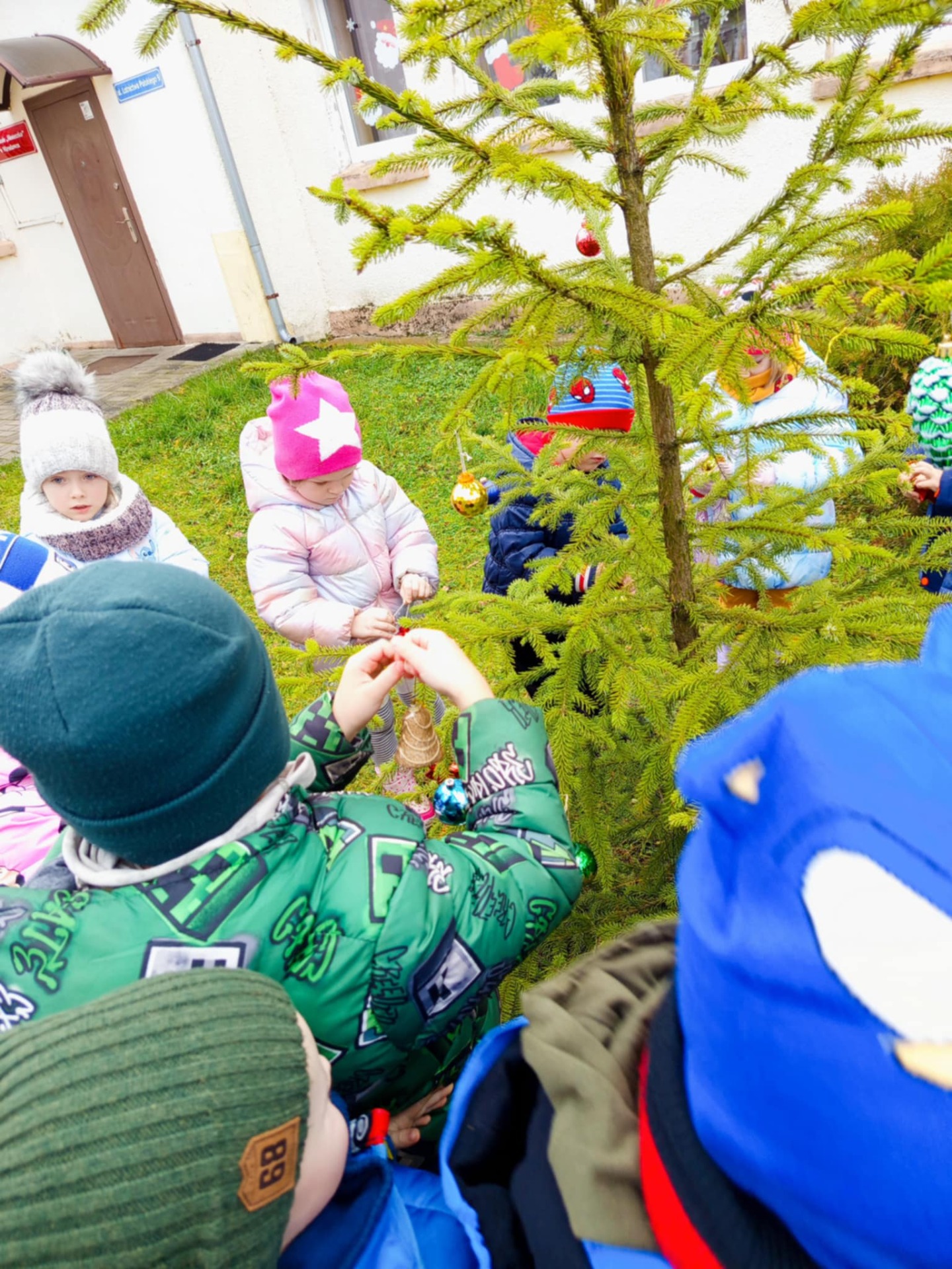 12 grudnia dzieci przystroiły choinkę, która została posadzona rok temu przed przedszkolem. W jej ubieraniu uczestniczyły „Biedronki” oraz „Motylki”. Podczas strojenia drzewka na twarzach najmłodszych widniały uśmiechy, dzieciom bardzo spodobało się dekorowanie drzewka. Teraz tylko pozostało nam czekać na śnieg...